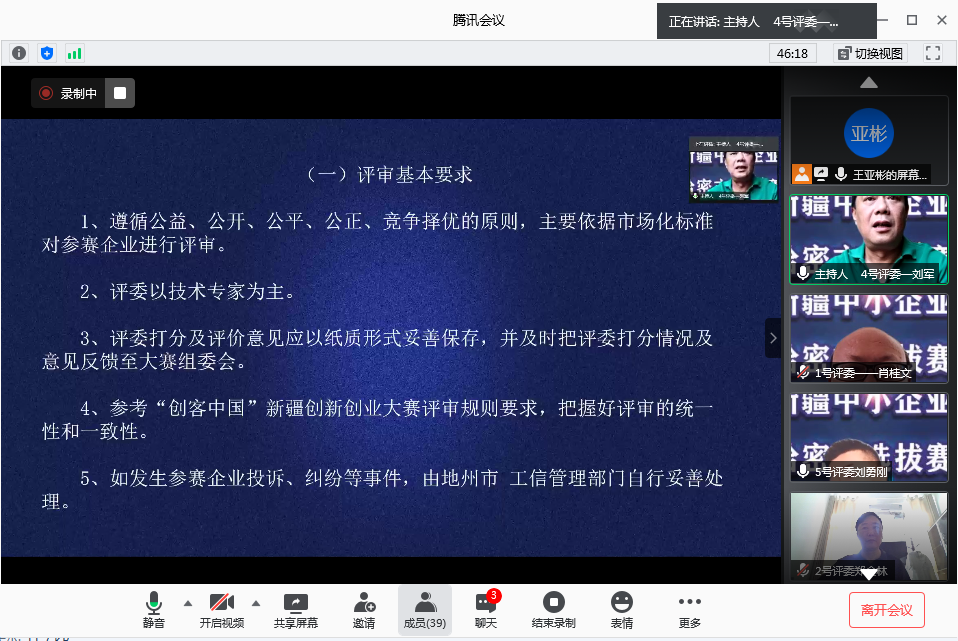 哈密赛区选拔赛邀请哈密职业技术学院高级工程师、工商管理硕士肖桂文、哈密职业技术学院院长助理郑金林、哈密市中小企业发展促进会秘书长、哈密市老科技工作者协会会长、高级工程师郭东京,哈密市中小企业公共服务平台总经理、哈密市中小企业发展促进会专职常务副会长、创业辅导师刘勇刚,哈密市中小企业服务机构联合会(筹)秘书长刘军等五位评审专家,对参赛项目进行现场评审,自治区大赛组委会秘书长吴芮、哈密市工信局中小企业科科长陈超在线全程监督本次赛事,参加本次选拔赛的还有参赛企业及创客团队代表、大学毕业生、大赛工作人员共40多人。
