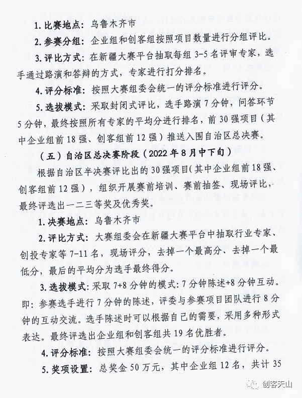 伊犁哈萨克自治州工信局、财政局,各地(州、市)工信局、财政局: 为深入贯彻落实党中央、国务院决策部署,进一步提升中小企业创新能力和专业化水平,推动中小企业高质量发展,根据工业和信息化部、财政部《关于举办第七届“创客中国”中小企业创新创业大赛的通知》(工信部联企业函〔2022〕108号),自治区工业和信息化厅、财政厅将共同举办第七届“创客中国”新疆中小企业创新创业大赛,现就有关事项通知如下: 一、大赛目的 激发创新潜力,集聚创业资源,营造创新创业氛围,共同打造为中小企业和创客提供交流展示、项目孵化、产融对接、协同创新的平台,发掘和培育一批优秀项目和优秀团队,催生新产品、新技术、新模式和新业态,推动中小企业转型升级和成长为专精特新中小企业,支持大中小企业融通创新,助力制造强国和网络强国建设。 二、组织机制 大赛设立组委会,负责大赛的组织实施。组委会主任由自治区工业和信息化厅党组副书记、厅长尼加提·司马义担任,副主任由自治区工业和信息化厅党组成员、副厅长胡晓华、自治区财政厅二级巡视员李刚担任,组委会成员包括自治区工业和信息化厅企业处、自治区中小企业局,自治区财政厅企业处等。 组委会下设办公室和秘书处,办公室设在自治区中小企业局,负责赛事活动的组织协调、技术保障、监督管理、全国500强项目推荐、评审规则完善等工作。秘书处设在乌鲁木齐众维汇联信息科技有限公司(第三方承办单位),负责赛事活动的策划组织实施、宣传推广、咨询服务等工作。 三、赛事安排 (一)赛事组成 第七届“创客中国”新疆中小企业创新创业大赛由地州选拔赛、自治区半决赛和总决赛组成。地州选拔赛由各地(州、市)中小企业主管部门主办,着力发掘和推荐本地区创新能力较强、发展潜力较大的中小微企业。自治区半决赛和总决赛由自治区工业和信息化厅、财政厅主办,围绕中小微企业发展热点、难点问题,聚焦实体经济和制造业的重点行业和专业领域关键技术。 (二)参赛报名 符合条件的企业和创客(以下统称参赛者)均可通过创客中国大赛官网(http://www.cnmaker.org.cn)或新疆大赛官网(http://www.xjmaker.org.cn)注册报名参赛。以上两种报名途径选择一种即可。大赛不向参赛者收取任何费用,未注册报名的参赛者不得参加大赛。 大赛报名截止时间为2022年7月15日。参赛者关注“创客天山”微信公众号及时了解赛事相关通知、要点及服务内容发布,掌握赛事资讯。参赛者同一项目或相似项目不可重复报名参加全国大赛组委会组织的专题赛、境外区域赛,对于重复参赛或剽窃、侵夺他人创新成果,以及用其他不正当手段骗取奖项的参赛者,一经发现取消参赛资格。 (三)服务机构报名 区内有意愿的投融资机构、小微企业创业创新基地、中小企业公共服务平台等通过大赛官网报名。通过参赛,充分展示发挥各服务机构技术、资本、市场等资源优势,促进产融对接、孵化落地和成果转化。 (四)赛事奖励 自治区总决赛采取“现场演示和答辩、当场亮分、现场公证”评选方式,设置一等奖、二等奖、三等奖、优秀奖,颁发奖金和证书。大赛同时设置优秀组织奖,对大赛筹备、组织实施以及后续对接服务中工作突出、成效显著的单位予以鼓励。 四、政策激励 优秀项目可获得以下支持: (一)宣传展示 通过“创客中国”国家创新创业公共服务平台(包括“创客中国”微信公众号、微博、头条和直播室等)、“创客中国”新疆大赛服务平台(包括“创客天山”微信公众号、视频号、网站、短视频直播等)、中国国际中小企业博览会、APEC中小企业技术交流暨展览会、新疆广播电视台《创业在新疆》栏目等渠道,对参赛项目、“双创”资源和对接成果进行展览展示、宣传报道和服务推介。 (二)投融资对接 向区内创业投资机构、银行等推荐,组织线上线下需求对接、产融对接、大中小企业融通等活动,集聚带动各类投融资机构为参赛企业提供多元化服务。 (三)落地入驻园区 推荐入驻区内的国家级、自治区级小型微型企业创业创新示范基地,享受最新创业扶持政策和创业孵化服务,加速实现产业化。 (四)成果转化技术服务 提供区内的国家级、自治区级中小企业公共服务示范平台上的检验检测、技术转移、数字化改造、工业设计等技术服务,以及法律、人力资源、财务、知识产权等服务。安排创业导师和技术、投资、管理专家进行辅导。 (五)"创客中国”全国500强企业在专精特新中小企业认定中予以政策支持。 五、工作要求 (一)各地(州、市)工信局必须严格按照《第七届“创客中国”新疆中小企业创新创业大赛组织方案》(见附件)牵头举办本地区选拔赛,不得随意更改赛事名称,不得随意套开、增设展会、赛事或论坛。请于2022年6月20日前填写《第七届“创客中国”新疆中小企业创新创业大赛XX地(州、市)选拔赛备案表》,报大赛组委会备案。 (二)赛事主办单位要严格执行中央八项规定精神,禁止向企业摊派、乱收费。坚持公益性,不得以营利为目的,坚持自愿原则,不得强制要求企业参赛。严格规范赛事流程,公开比赛、评委当场亮分、结果对外公示和公布。 (三)各地州选拔赛均须于8月12日前完赛,并将推送入围自治区半决赛的优质项目报送至大赛组委会。 (四)各地(州、市)工信局,区内的国家级、自